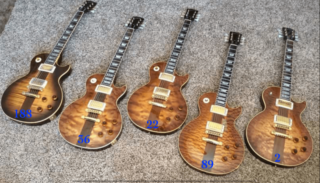 The bodies are one-piece mahogany and they can feature 1-piece or 3-piece Mahogany Necks. The 3 piecers tend to have the larger neck profile of the two. As far as the electronics, many tend to have ’80 + ’83 Dated Pot Codes or ’83 / ’83 with all of them having Tim Shaw PAFs stock.