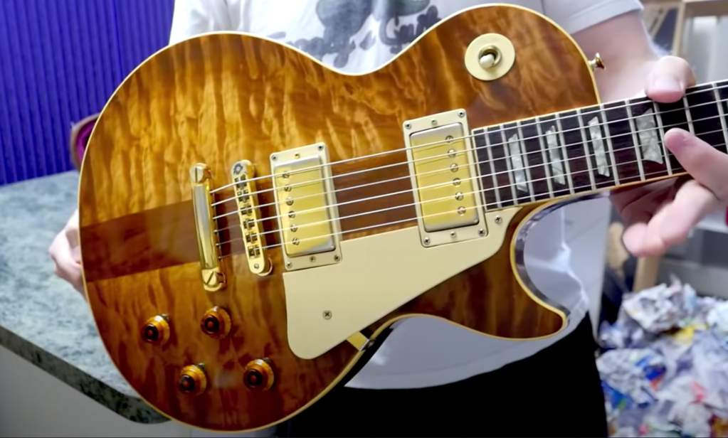 The headstock has a walnut veneer which gives them a generally darker appearance, especially since Gibson didn’t use the yellow grain fill like they did on the original run. Some mild headstock reshaping and logo changes happened as well. The Grover tuners have pearloid tips to mimic the original pearloid tipped Schallers.