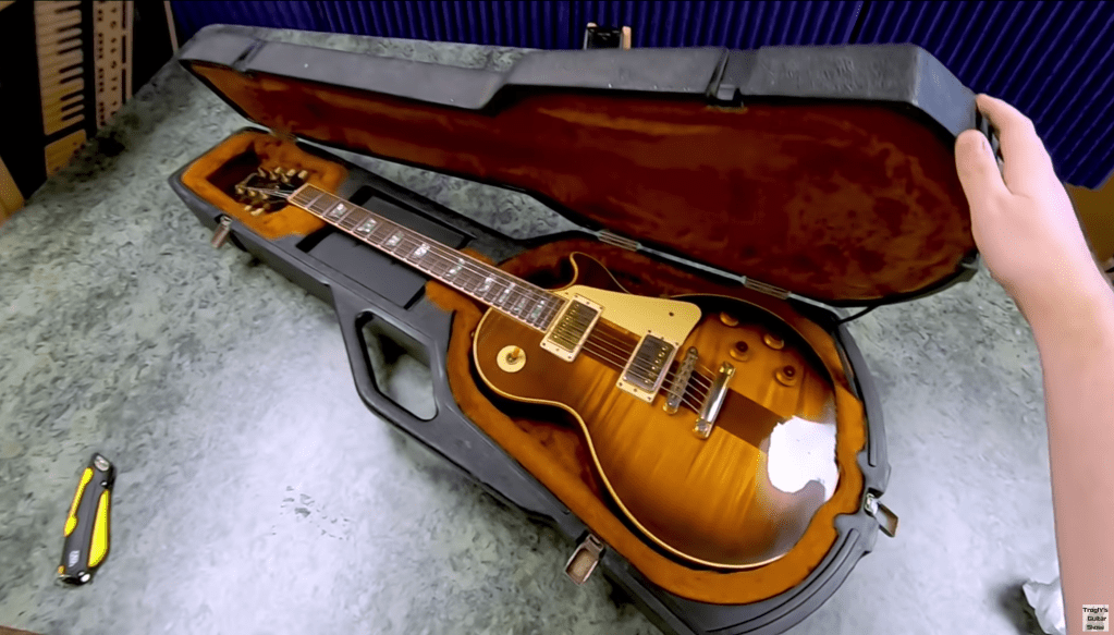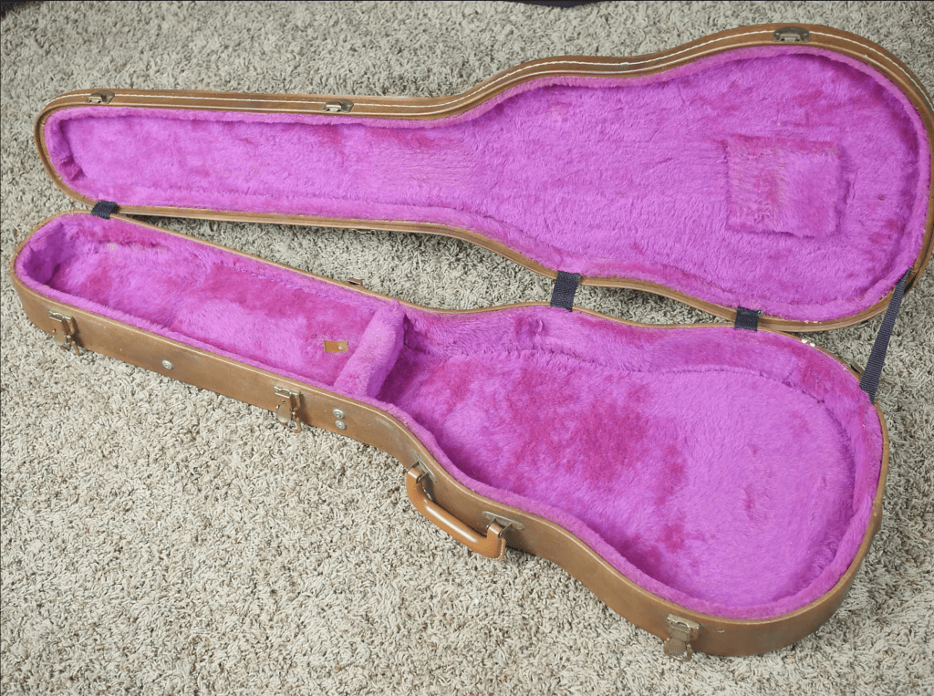 You don’t find this version as often, but it is the “premium” original case for one of these. Gibson is stenciled on the outside and it has a brown exterior with a pink interior. These are stylized after the cases that Gibson used on the burst in the 1950s. 1983 was the year Gibson launched the “Les Paul Reissue” that we refer to today as the “Prehistorics.”