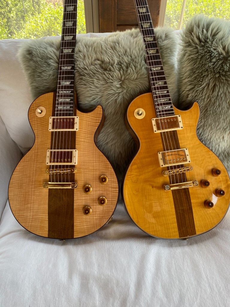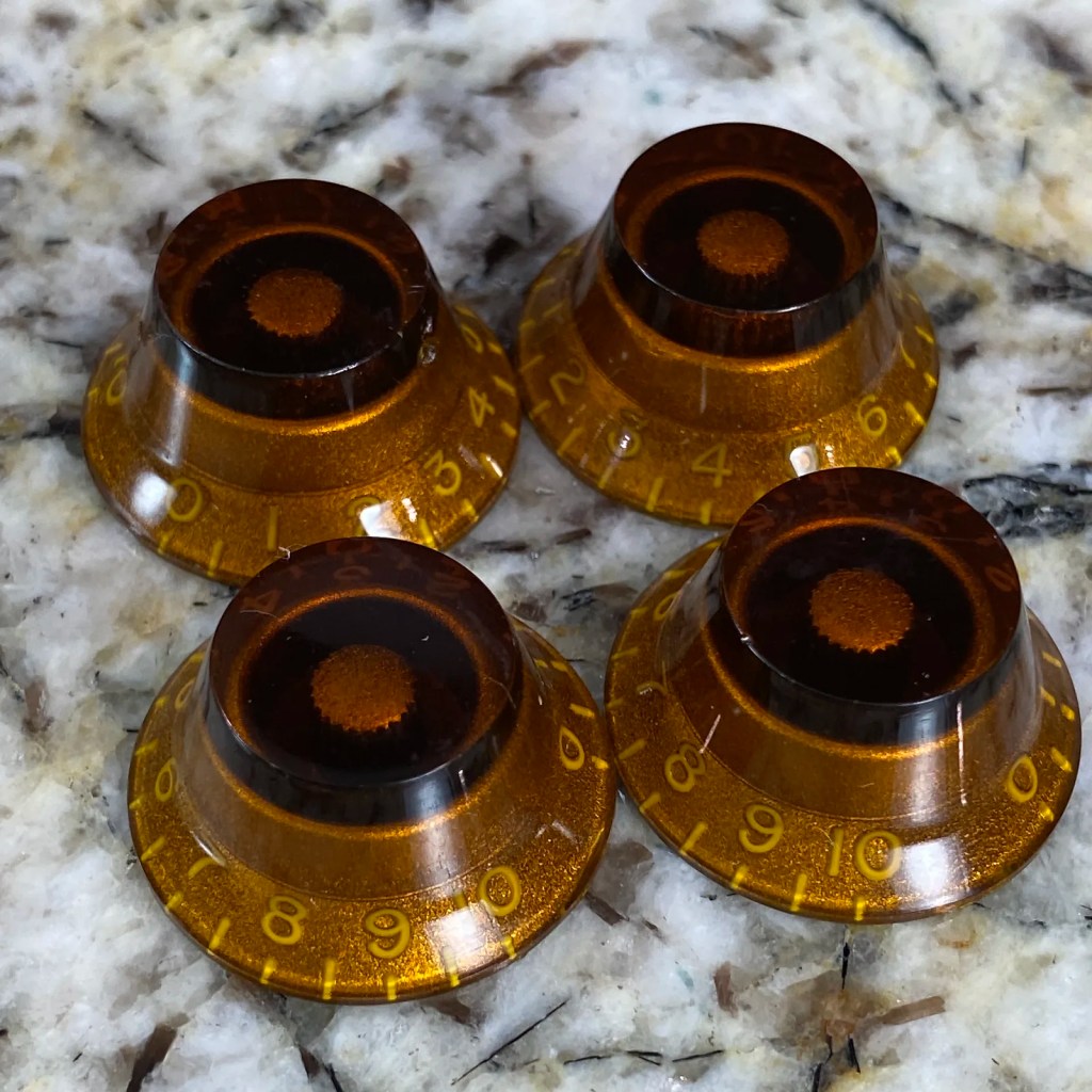 They were all adorned with Gibson’s “UFO” amber reissue style knobs with gold hardware and cream plastics on the front with brown backplates.