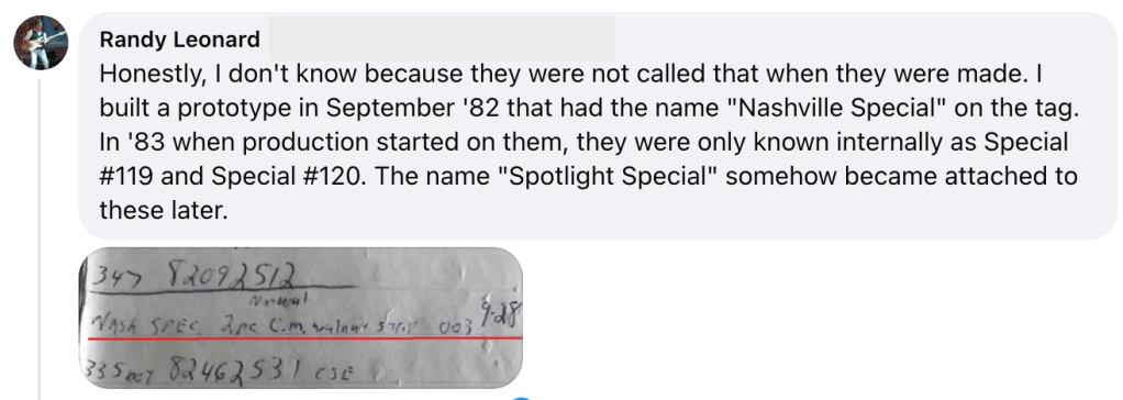 According to Randy, he built the prototype in September ’82 that had the name “Nashville Special” on the tag. In 1983 when production started on them, they were only known internally as Special #119 and Special #120. The name “Spotlight Special” somehow became attached to these later.