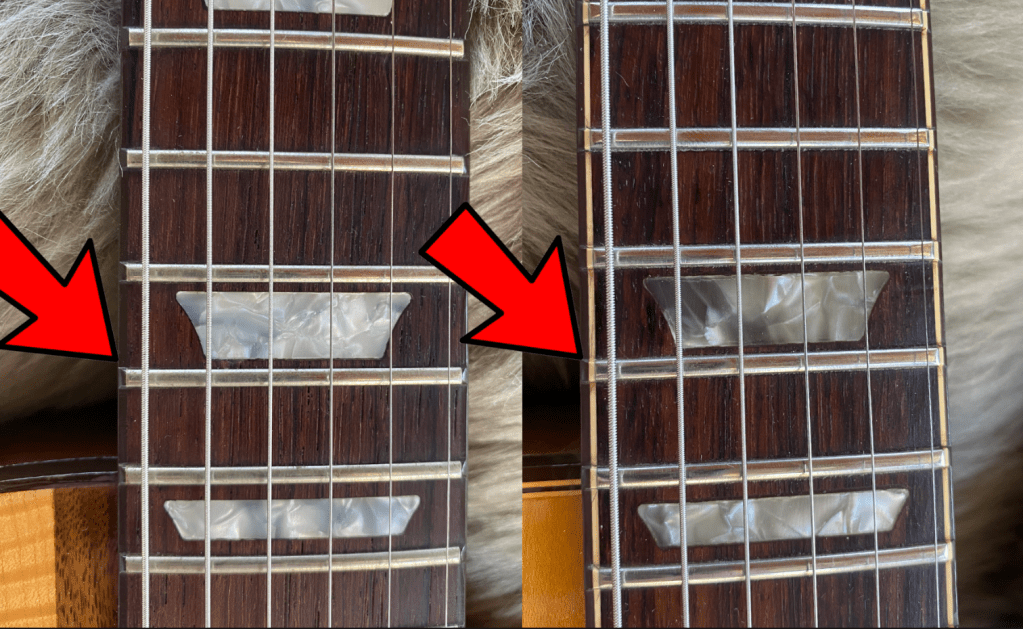 The ANT Spotlight Special features dominate BROWN binding. The body has 4-ply Brown/cream/brown/cream binding and the neck has 2-ply binding Brown/Cream. Not only do most Les Paul not have brown binding, but it is unusual for a STANDARD to have a double bound neck and especially a 4-ply bound body! A regular Les Paul Standard only features single-ply cream on both the body and neck. Due to Gibson’s unique “binding over the fret” application, that grants us MULTI-COLORED fret nibs which is a seriously cool feature! Refretted ANT examples sadly loose this distinctive appointment 😦
