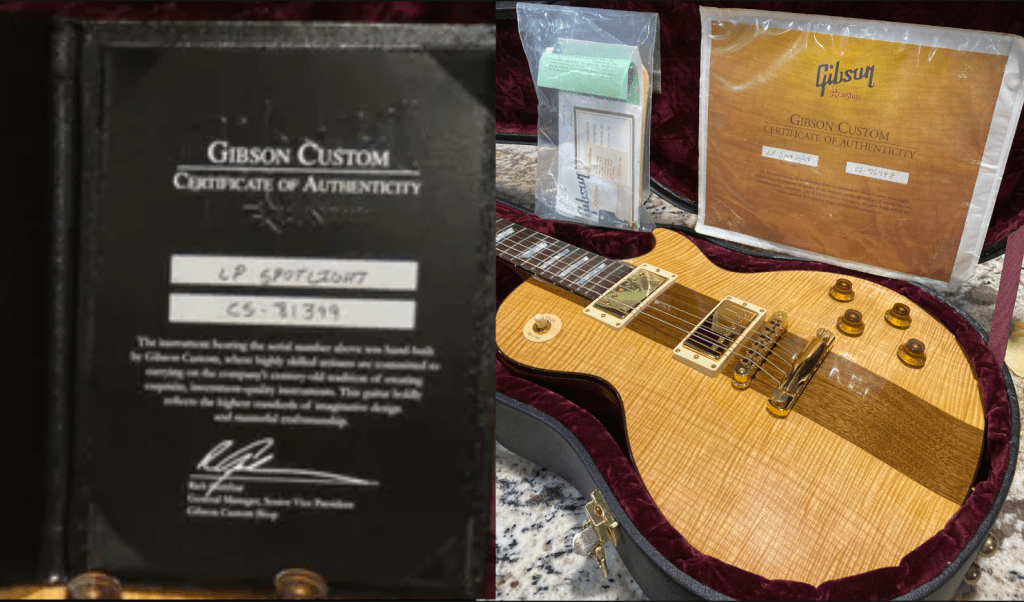 Depending on the year your Custom Shop Spotlight was made will determine if you have the “old style” large paper COA, or the newer smaller booklet. If your spotlight doesn’t have a COA – it was likely lost and of the paper variety since they don’t neatly fit in the case. They were officially labeled as “LP Spotlight”